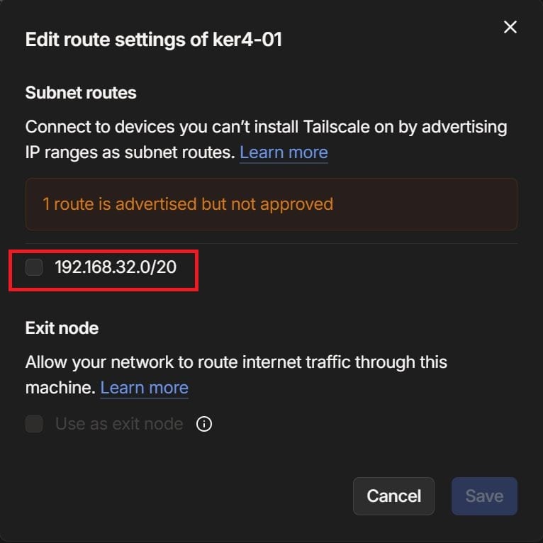 # tailscale up --advertise-routes "192.168.32.0/20" --accept-routes --snat-subnet-routes=false